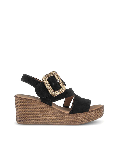 Gorgeous high wedge sandal from Gabor with a large buckle & rattan look wedge with platform sole.