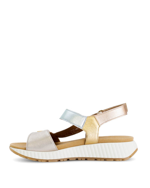 Beautiful low wedge sandal from Gabor in a mix of metallics with a velcro strap.