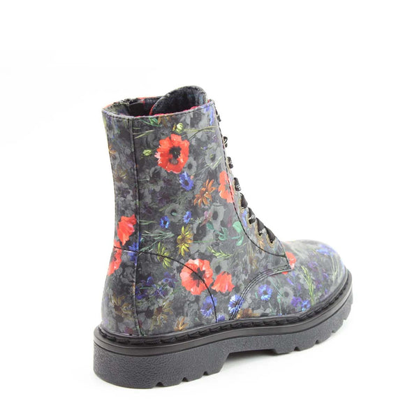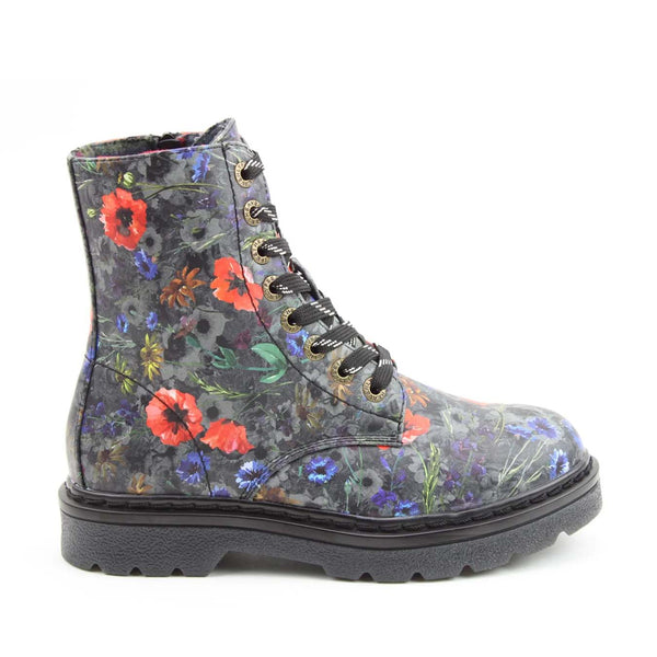 Heavenly Feet Poppy adds some real panache to this fabulous style. This vegan friendly boot has an easy wipe clean upper, with a striking poppy print floral pattern, making this style the ideal boot to wear with a wide range of outfits this season. With an 8- eyelet lace and the addition of a full length side zip this boot offers great support and easy on/off the foot fitting. Comfort is a given with our innovative removable memory-foam comfort inner-soles and super soft plush linings. This is a sure fire statement boot and is at home with edgy fashion as paired over jeans/leggings or with a skirt.