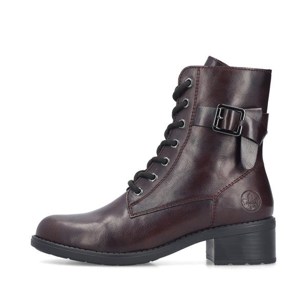 Beautiful laced boot from Rieker with a low stacked block heel, Side zipper for ease of wear & cute buckle detail.