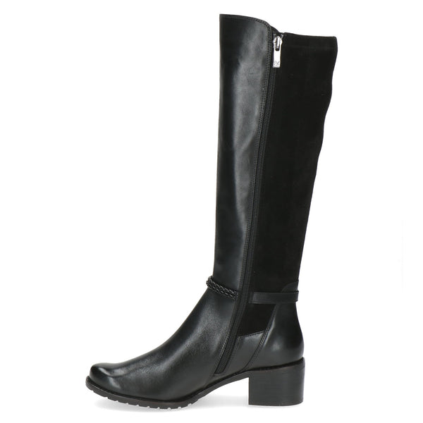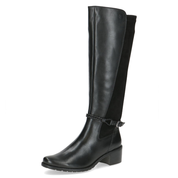 Beautiful knee high boot by Caprice with a block heel in a combination of leather & stretch textile.