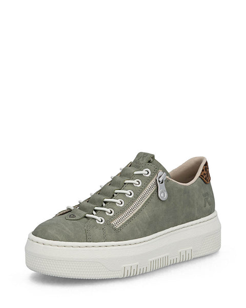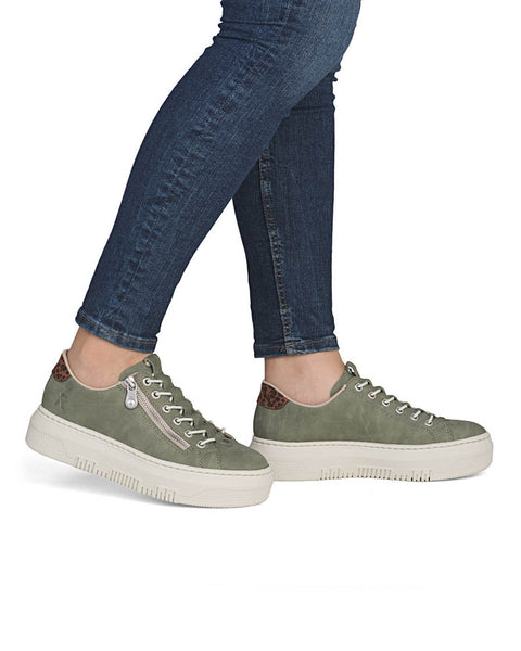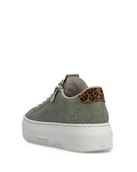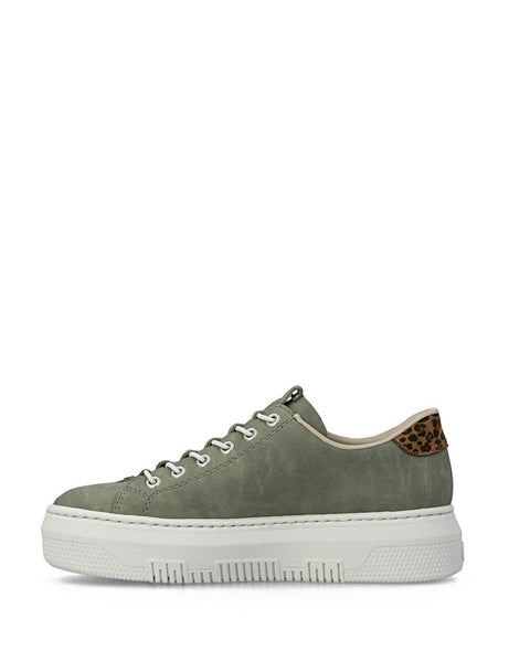Modern flatform trainer fromRiekerin moss green with a leopard trim.Featuring a padded Rieker antistress insole ensures superior comfort that supports your feet throughout the day.