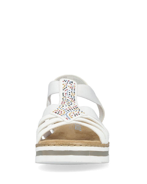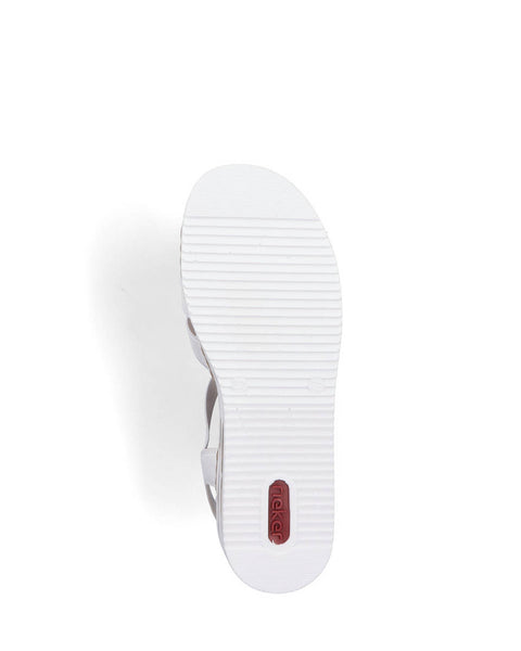 Lovely light weight wedge sandals from Rieker with an elasticated straps & a cute multi coloured decoration. Cushioned footbed & elasticated straps for comfort.