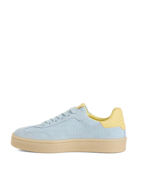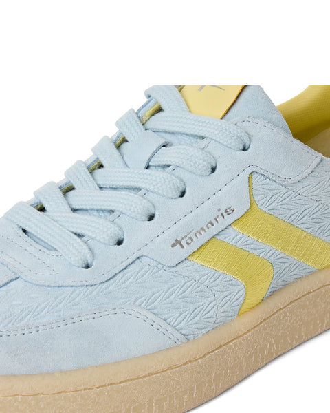 Beautiful suede trainer from Tamaris in light blue with gold trim & modern gum sole.